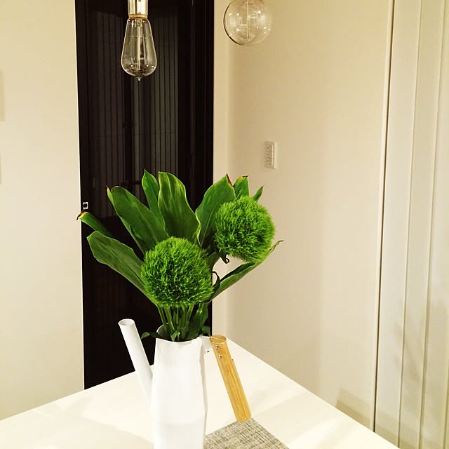 スーパーのお花屋さんシリーズ☺︎グリーンのぼんぼりみたいな子に釘付けになりお持ち帰り。今回は名前聞いたのにうろ覚え…(・・;)しゃくなげ…⁉︎まさかのお花の種類だったはずなんだけど…‼︎