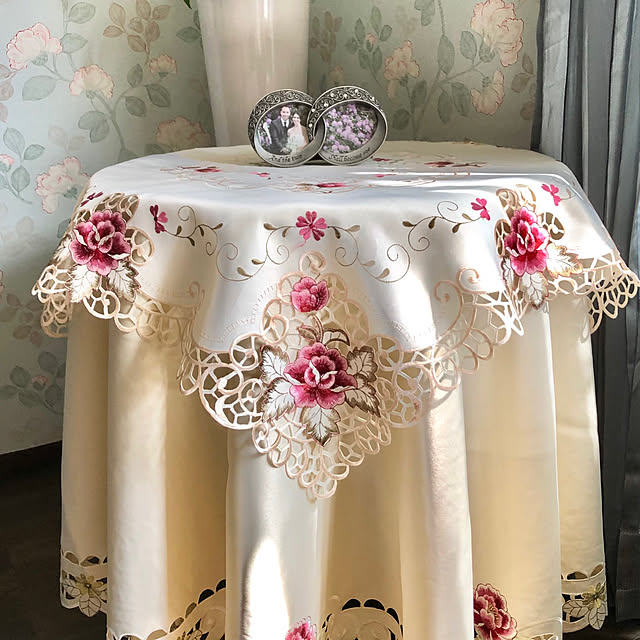 クロスの端の裏側が、正面から見えてしまう掛け方の方がしっくりしたので、裏側縫い目の上にレースを追加しました(外から見えてる部分だけ)🥳