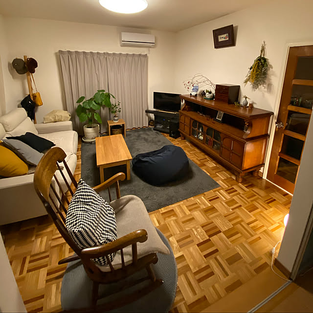 ロッキングチェアのクッションを秋冬用に変えて、寒くなってきたのでブランケットも置きました