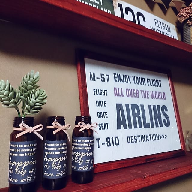 我が家の極小すぎる玄関‼︎‼︎ このお家の一番の難点…。 それでも好きになる為に努力してます‼︎ 入り口には余った1×4を敷き詰めました‼︎ 塗装は彼いわくブルックリンスタイルだそうです…! 正面にはこれまた建具で作ったガラスショーケースを* 中にはアジサイとユーカリのドライ、イギリスのバスチケットを貼り付けてます*