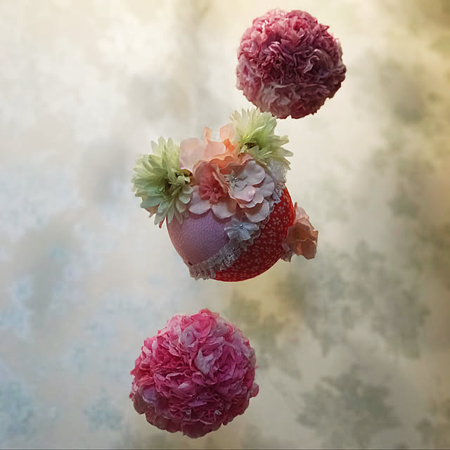 pinterest(ピンタレスト)では、小さな花の真ん中にパールのまち針で発泡スチロールに刺していくものが載ってました。
