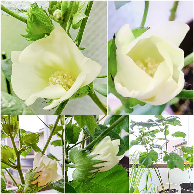 洋棉の蕾2個が、今朝からいよいよ開花し始めました。