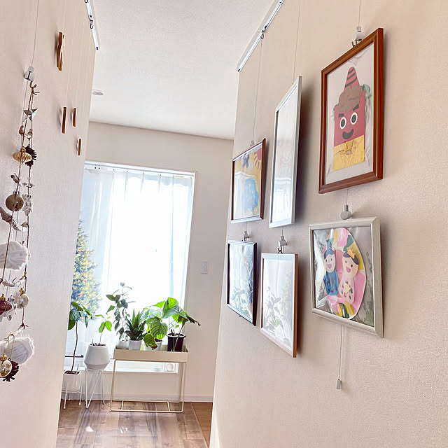 リビングにはピクチャーレールを使って壁掛けしてます。 ラタンミラーや、クラフトバンドで作った星の壁飾りを掛けてます😄
