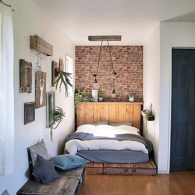 〰️つっぱり棒の活用方〰️ 寝室にドローアラインを取り付けてフェイクグリーン、棚にはリモコンや羊ちゃんを置いてます❤︎