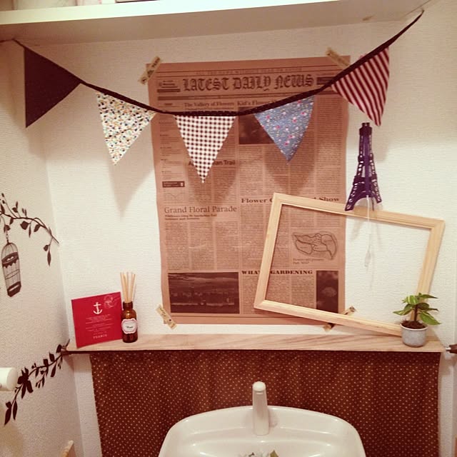 我が家のトイレ。 芳香剤の香り付きガーランドと、セリアの英字新聞風包装紙とクリアファイルを使ったトイレットペーパーストック。 タンク上には、フェイクグリーンに使わなくなったビーズネックレスを巻きつけて飾っています。 窓辺には、ミニサボテンとガラスボトルに入れた消臭ビーズを。 壁には、セリアのリメイクシートを貼っています。