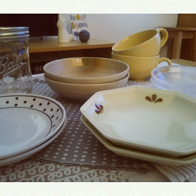 左←の食器棚が実家で長年使っていた物かなり年季がいってぼろぼろだけどガラスの所が使いやすく。捨てられず😢