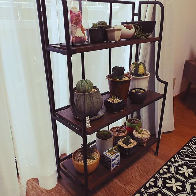キッチン側の写真です。 カウンターがなく、物を置く場所が少なくこまっていたところ、ニトリの組み立てられるシェルフを発見!!これを合わせれば…?とかんがえ三つ重ねたところ、とってもいいかんじ!お得でとってもおしゃれになりました。 飾り棚はこれから色々かんがえたいとおもいます。