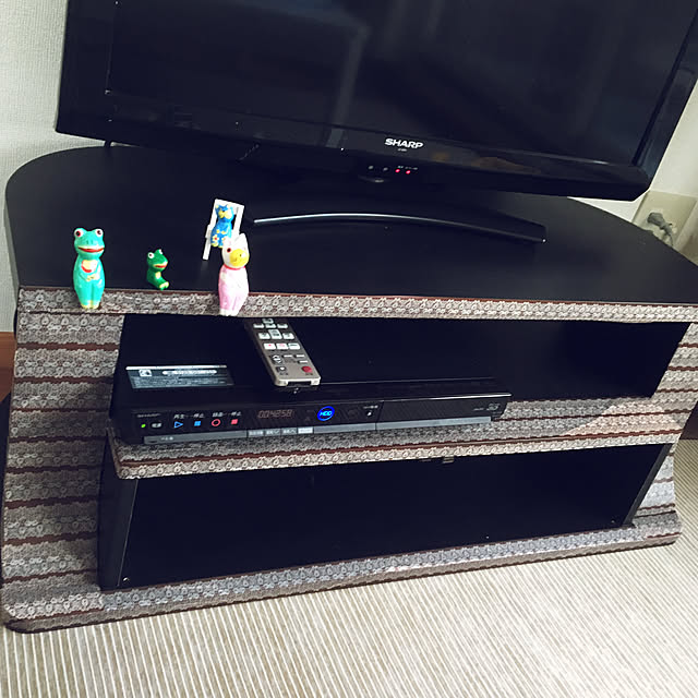 セリアのフリークロス?で作ったテレビ台のごちゃごちゃ隠しカバー★ テレビ台、子どもにボロボロにされたので買い替えるまでの一時しのぎです(^^;;