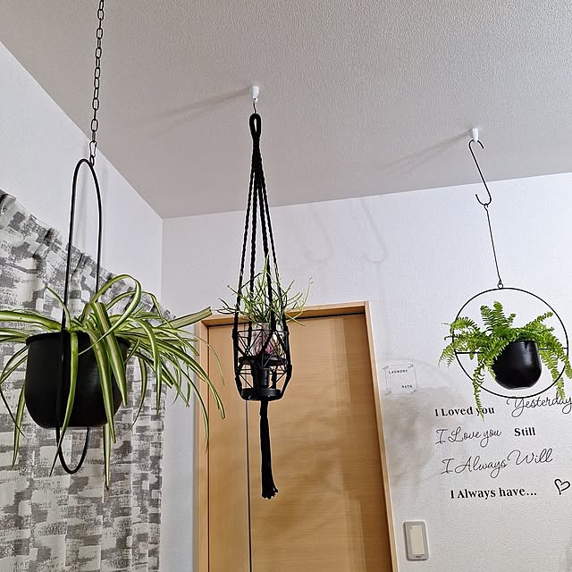 イベント参加 わたしの趣味時間 癒しを求めて、部屋の緑化を始めました。グリーンが育ってきたので、外からの目隠しを兼ねて、一部ハンギングにしています。 余っていたピクチャーレールのワイヤーで長さ調節していますが、この方法、日差しの角度によって短くしたり、水やりのときに長くしたりできるので、とっても便利です🌱
