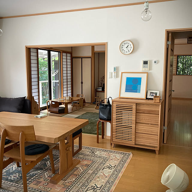 ようやく暑さも和らぎ季節を楽しめるようになりましたね🍂 猛暑で有り難かったのが和室の存在です。 冷んやりとした畳に寝転がる気持ちの良さに癒され寛げました♪ その和室を少しイメージチェンジのためシーリングライトからアクセントになるペンダントライト、見えづらいですが襖を全体がシャンパンゴールドで細かいサクラ模様入りに張替えしました。 今までのリビングと和室でまとまりきらない感じが、北欧の照明のおかげで一体感を伴った気がします😊 ①和室 ②リビングと和室 ③照明を下から撮影 ④和室があまり写ってないですが以前のpic