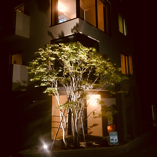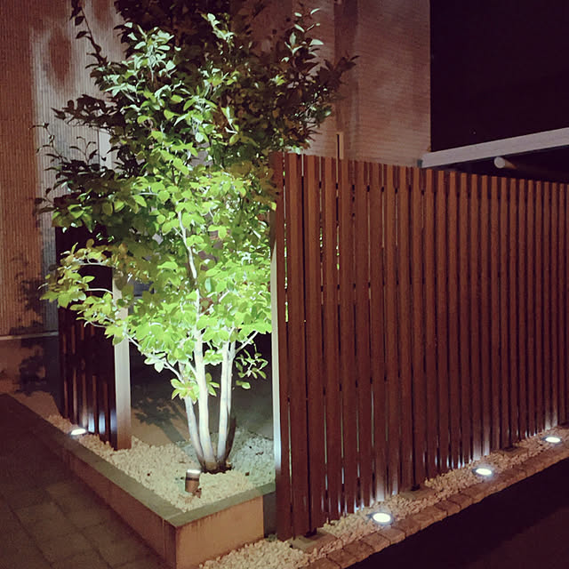 門柱とシンボルツリーを照らしてるライトは、以前設置した木のひかりセットです。