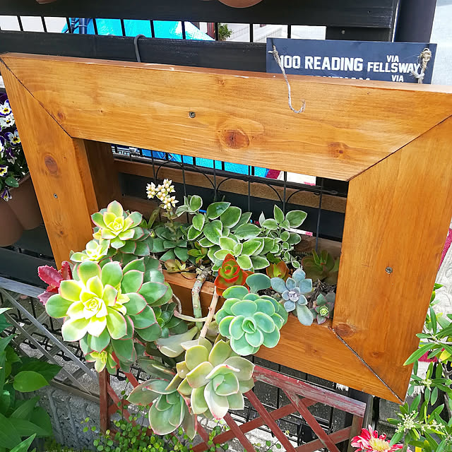 皆さんから遅れに遅れて 額縁プランターに 植物を飾って見ました。 あー、寄せ植えが全然ダメ過ぎ😭 ペイントは、手持ちのもので 気に入った色に仕上がりました。 とりあえず撮影の為、玄関先の セダムコーナーに置いて見ました。 最大級の台風🌀が来るとの事で 撤収!撤収! 1番手前にある多肉植物のリメ鉢は 昨日WSに参加して作ってた物です。 リメ鉢のペイントのコツとか教わって とっても楽しかったので また家でもやってみよー。