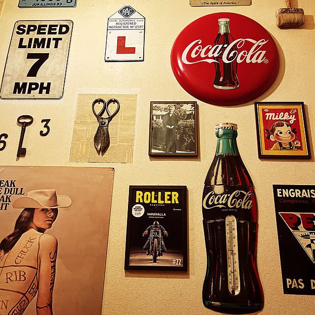 #窓側の壁画を飾るヴィンテージ雑貨達