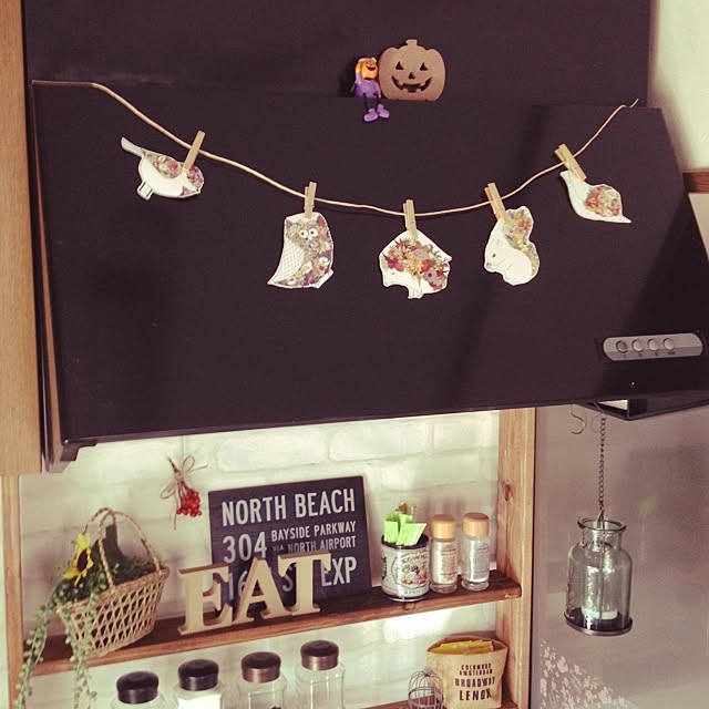 リビングから見える換気扇... ちょっと見栄えよく模様替え♡ ガーランドはIKEAのポストカードをリメイク(*^^*)
