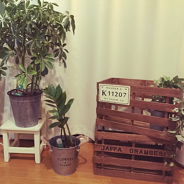 テレビ横の観葉植物とホームセンターで購入した木箱! 見せたくないものをしまえるボックス、見た目も可愛いからそのままリビングに置くだけでオシャレに見える。 この観葉植物とただ置いてある収納ボックスの組み合わせ。 お気に入り空間。