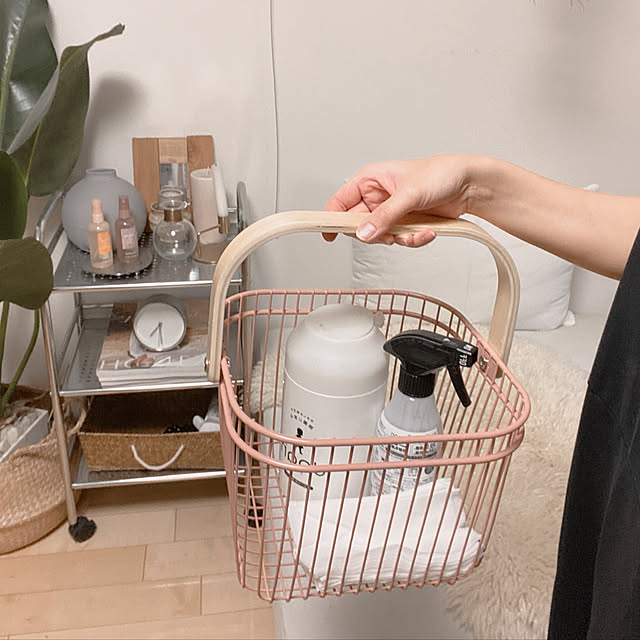 2個目はこれ♥️ 山善andWoodシリーズの バスケットです!(2個セット) 写真では一つだけ置いてます。 色が可愛い!! うちのラグや小物に暖色が多いので、 女子っぽくピンクにしました♥ このピンク、楽天の写真よりも笑 可愛いです!!ピンクなんだけど大人ピンクでマットなおとなしいかんじ🥰🥺ピンク?って思うけど手を出して大正解な方! だめだ語彙力_( :⁍ 」 )_ カゴの網目は少し大きめで中身が見えるから入れるものも楽しめるかな♥️ またこれもandWoodな木を取っ手に使ってて 都会的と言うよりは柔らかい印象になるかな♥️ ここではパパっと使う除菌や掃除用具を入れてます♥