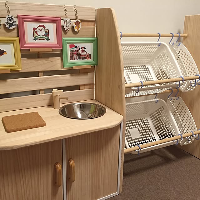 今回の収納見直しで、端っこのデッドスペースに突っ張り棒をつけて、ぶら下げ収納できるようにしました。