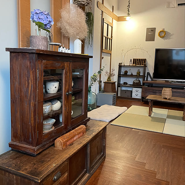 うちはほぼ木製家具です。 手前の家具は上と下別々の物で下は習字塾で使ってた引き出し 上のキャビネットは雑貨屋さんで見つけた物 奥の棚と踏み台はリサイクルショップで見つけた古家具 習字塾の机などなど、、  キャビネットの上の紫陽花❣️前に長持ちさせる方法で水挿しした子ですがまだまだ元気です✨