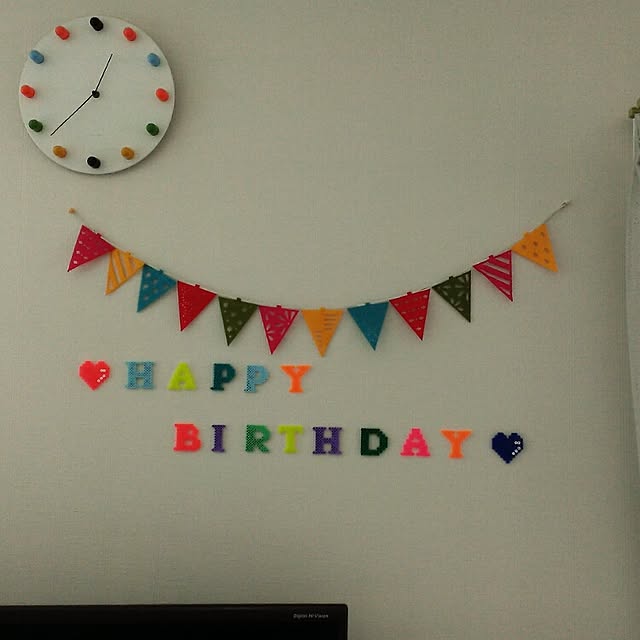 ファブリックに合わせたカラーのパーラービーズでウニッコ風を3つ作ってガーランドっぽくかけられるように作りました💕
