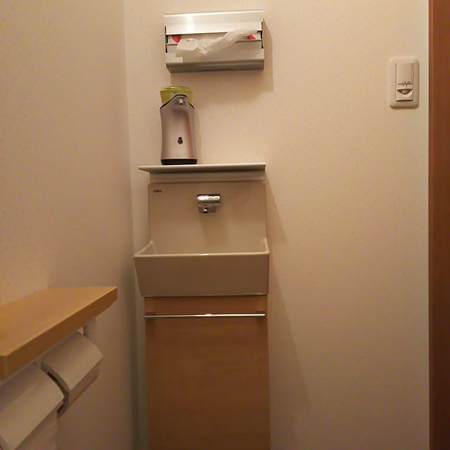 使えるよう、うがい薬や手ピカジェル、紙コップ、ペーパータオル、反対側のニッチに