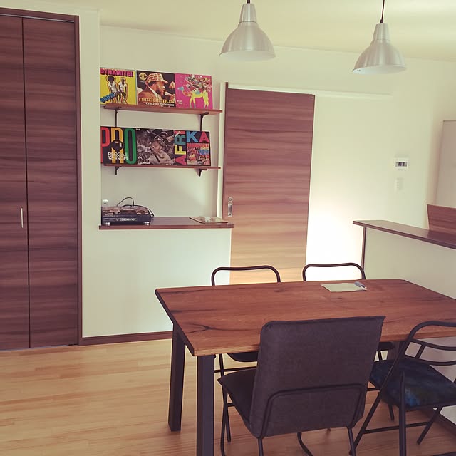 ようやく届いたお気に入りのダイニングテーブルとチェア。 照明ともいい感じでマッチしてるかな。