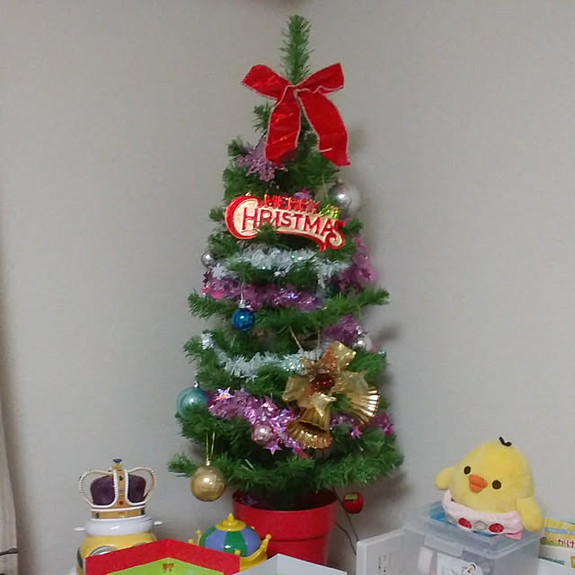 モミの木風の大きなツリーにしたかったけど、いたずら盛りの次男1歳児が何するかわからんので、棚の上に飾れるサイズに。