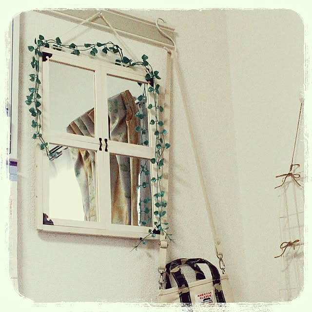 いつもはあまり使わないパープル💜を組み合わせて百均のミラーにリースをくっ付けて見ました