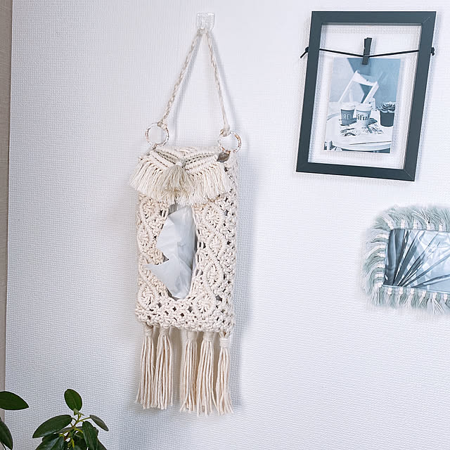 マクラメで編んだティッシュケース。 しっかりしていて出し入れしやすいデザインで、汚れたら洗濯機で洗えて便利です。 インテリアの一部のように溶け込むのでお気に入りです。