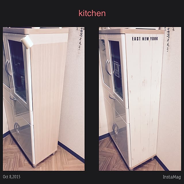 仕上がりはこんな感じ♡ 狭い食器棚なので電子レンジを置くとだいぶ隠れちゃうのでほぼ自己満足の世界ですが。。(^-^; 施工事例にも載せて頂きました! http://www.room-art.jp/everyone-of-diy.html ちなみに、まだ無料キャンペーンやってるみたいですよー♪( ´▽`)