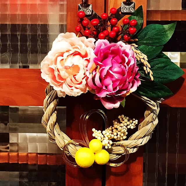 ダイソのリースしめ縄をダイソーのフェイクフラワーでリメイクしました。 RCのみなさんの作品を参考にさせて頂きました。