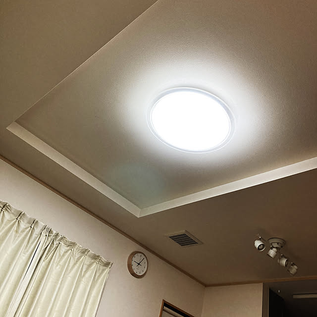 我が家のリビングの特徴はハーフサークル窓と凹凸がある個性的な形の勾配天井です☆ この独特な天井の形をいかすように壁紙をモールディングで区切って貼り分けしたり、スポットライトを一部上向きにして天井を照らしたり工夫しています(^^)