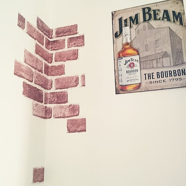 白い壁が嫌だったのでダイソーのリメイクシートでスクラップウッド風に貼ってみました! レンガ柄やらでガチャガチャしてるのは気にしない(笑)