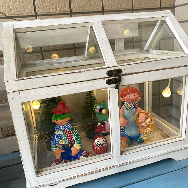 ベランダのサリュのホワイトハウスにjijiさんの粘土人形とお正月飾り🎍 だるまさんと羽子板を飾りました❤️😊