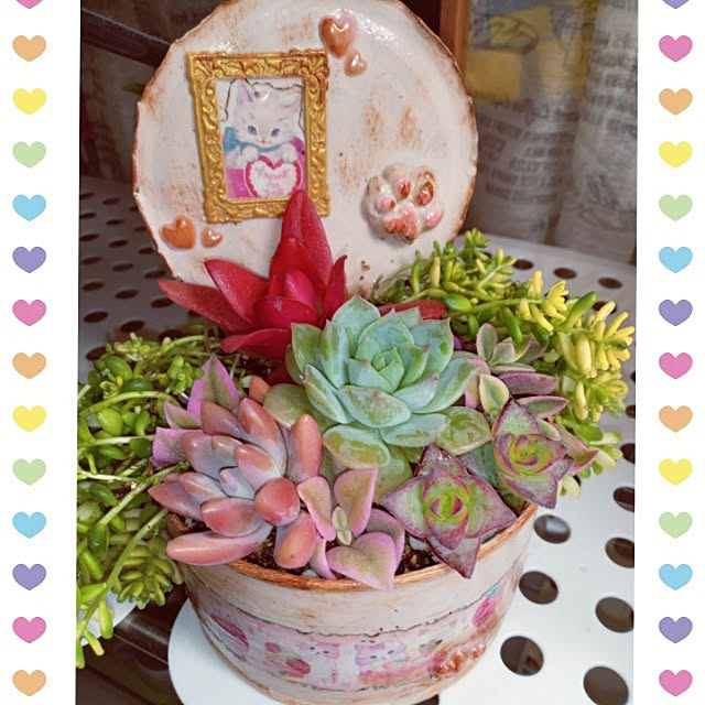 おはようございます🍀 我が家の癒しスポットが 増殖中!✨🌵💕❤️❤️⤴️ 昨日、寄せ植えしたネコちゃんの肉球付きリメ缶も一緒に💕🐾⤴️