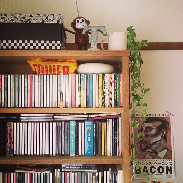 主人のCDコーナー。いまだに音楽はCDで聴きたいらしく、CDで溢れてます。 ここに収まらないものは、別の部屋に…断捨離してほしいものです。