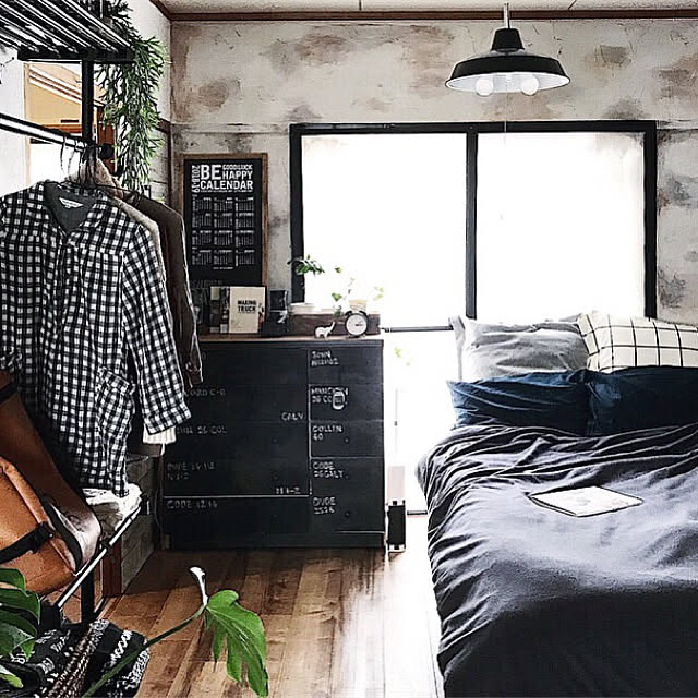 白、黒、グレーメインの我が家の中で唯一暖色系な寝室。 ここだけは旦那が壁紙、カーテン、カーペットを選んでいます。 壁紙はアクセントクロスにダマスク柄、その他はボーダー カーテン、タイルカーペットは紫色 ベットはダブルベットを2つくっつけています。 男の人がチョイスしたとは思えない空間だけど、モノトーンや無機質が好きなあたしも意外と居心地よくて気に入っています( ՞ਊ ՞)笑 あたしも娘もアトピー持ちだからこの時期の乾燥は大敵。 だから加湿器は我が家にはかかせません。 部屋の雰囲気を崩さない、スタイリッシュな加湿器を探していてようやく見つけたお気に入りです♡