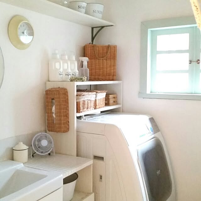 狭い洗面スペースを既製品とDIYで収納力と機能性のある洗面スペースにしています。