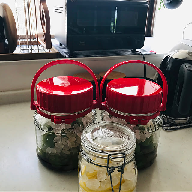 持っている瓶は、口に近いところがシェイプされていたり、蓋が小さい為、シロップや果実の取り出しがしずらいですが、これは寸胴で直径が大きめだったので、まさに果実シロップ保存に重宝しました🍋🍋🍋
