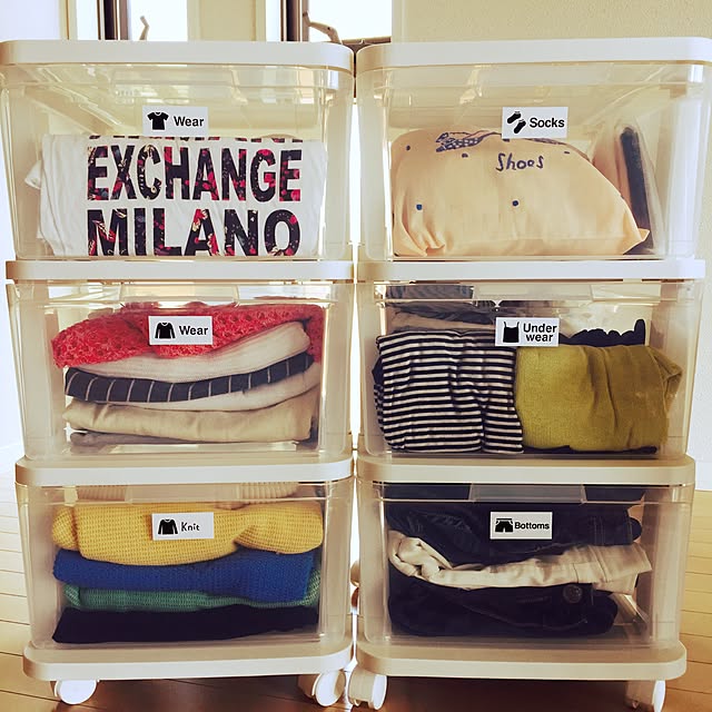 似たような服で溢れてますがそれなりに使いやすくなっています(笑)服の長さに合わせて下のスペースに衣装ケースをセット☆ケースはかなり昔から愛用していて丈夫で長持ちしています♪