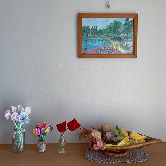 玄関は チューリップ🌷だらけです。 私が折り紙で作ったチューリップ🌷 母が 藤で編んだチューリップ🌷 父の水彩画も チューリップ🌷 チューリップ🌷で親子の共演です🎵