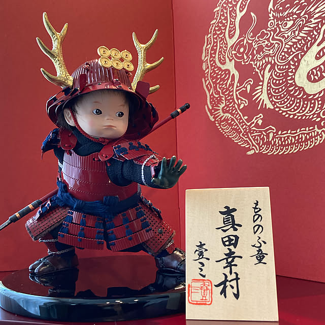 我家の兜は真田幸村。何年か前に大河ドラマになりましたね。私は歴史に疎くどんな人物なのか詳しくは知らないのですが…。 落ち着いた赤に鹿の角が素敵で、私の趣味でこちらに決めました。
