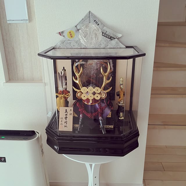 五月人形の置き場は今年から階段上スペースになりました🎏息子ふたりの木札を置いてます🙌🏻