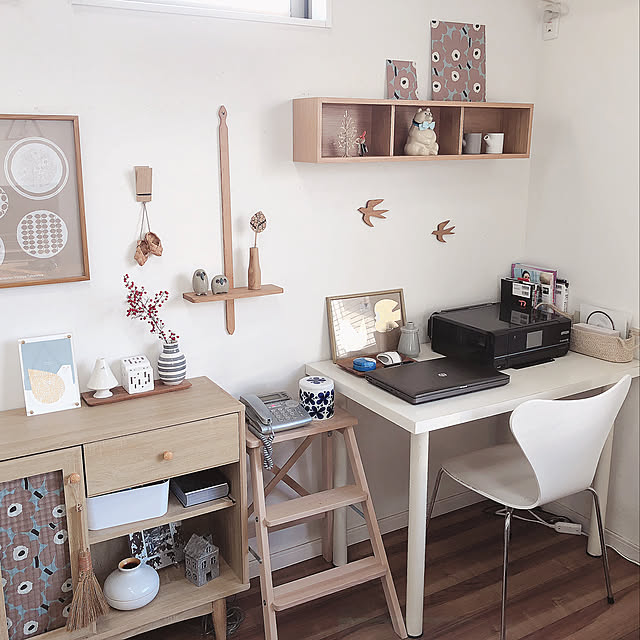 なるべく生活感がでないように、筆記用具は全て木製トレーの上に。多色ボールペンいっぽんとメモ帳、マウスだけ置いています。それ以外は全てミニチェストの中へ収納!使う時だけ取り出す用にしています。デスク周りも大好きな北欧雑貨で統一❤︎*.(๓´͈ ˘ `͈๓).*❤︎