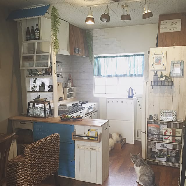 我が家のキッチンカウンターです。 キッチンカウンターは、ニトリ製品 カウンターの上のカフェ風ショーケースは、手作り品Creemaって手作り品サイトで購入しました。 気に入ってます。