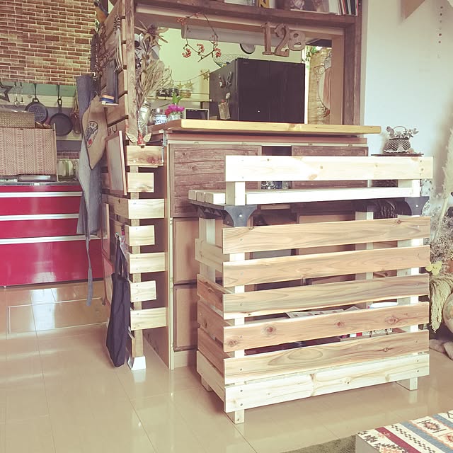 ニトリのカラボでキッチンカウンター作りました。 天板はホムセンの塗装済みのを置いただけです。 裏側もホムセンで買ったプラダンを切って両目テープで貼りました