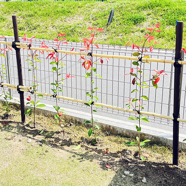 レッドロビンの生垣作り。 1枚目…完成 2枚目…意外にまとも?にできた支柱 業者さんに頼むとお高い…ということで庭仕事経験初心者夫婦で作ってみましたよー。最初は色々結び方とかを調べながらやろうとしましたが、さっぱりわからん🤣さて、そこは大雑把のOの私。適当でよくない?とほぼ自己流で完成❤︎果たして育つのか?また経過を載せていきたいと思います。