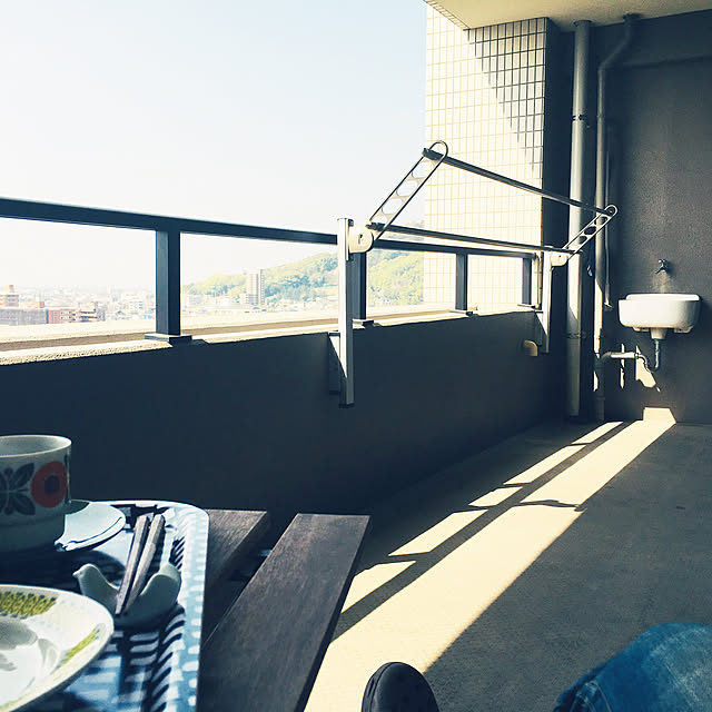 おはようございます(^^) 連休二日目 昨日に引き続き、今日もぽかぽか陽気 朝からまったりベランダカフェ ・・と言っても、IKEAのテーブルセットが置かれてるだけで、ザ殺風景なベランダです…(ノ_<) 黒い手すりの奥に花台がありますが、花や植物はなく・・以前、旦那さんはここに水を張って亀池を作ろうとしてました(←挫折)