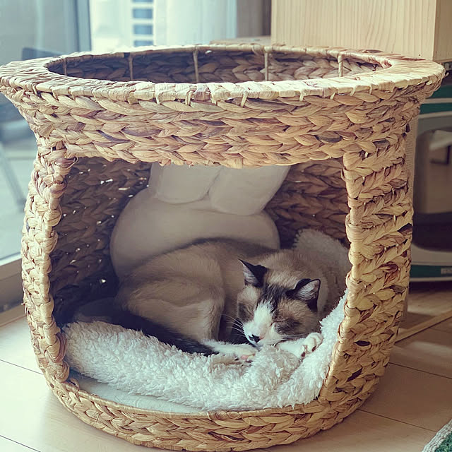 2022 6月 お部屋造り 猫ちぐら、若い猫が老猫に煩く構うので与えたところ、思惑通り、いつもこの中に逃げ込んで攻撃を逃れてくれています。 ホッ