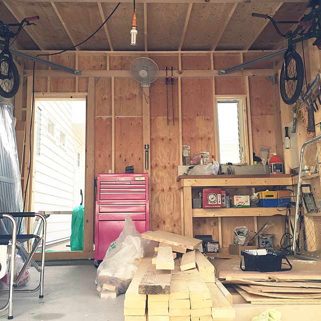 新たに稲葉物置を購入!!!物置倉庫では1番おっきいやつです(笑) DIYした内装をちょこっとだけ載せておきます! 知り合いの家から譲ってもらった掃除用具が入ってそうな物入れを艶消しブラック、そして取手は金に塗り直してリメイク! 壁はトタンを艶消しブラックに塗装して貼り付けしてみました! そして余っていた棚板をこれまた艶消しブラックで塗装をしてステッカーをペタリ!ダイソーにあったポッチを貼り付けてリベット風に!!! そして角パイプを切って溶接して作業台を作りました!パンチングボードも貼って見せる収納です^ ^