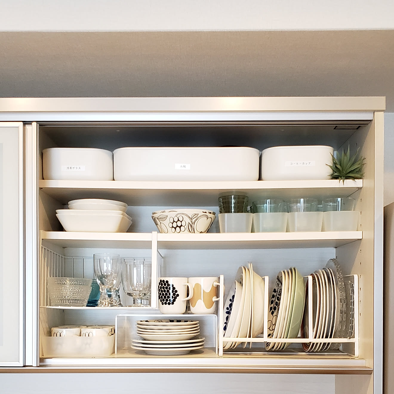 食器棚の収納。 普段使いは下2段、来客用や季節ものは箱に入れて上2段に収納しています。 使用頻度が高いものほど手の届きやすい場所に置いて、使いやすくしています。 左右の棚板位置を揃えると、こんな風に扉をガバッと開いたときの見た目も悪くなりません。 おすすめの収納アイデアは②のボトル収納です。無印のファイルボックスとブックエンドで作りました。ボトルを立てて収納するスペースがないときにおすすめの方法です。